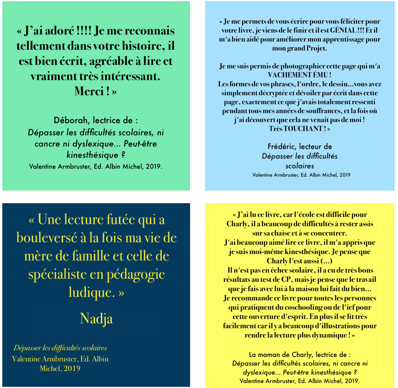 Mon propre fonctionnement kinesthésique et mon parcours d'ancienne élève m'ont permis de développer une méthode très efficace. Cette méthode m'a donné les moyens de poursuivre mes études malgré un système scolaire qui ne tenait pas compte de mon profil d'apprentissage. J'ai pu obtenir un Master 2 avec mention 👩🎓, écrire un livre ✍️ 📙 et aujourd'hui, c'est avec cette même méthode que j'aide de nombreux élèves (de 8 à 19 ans !) dépassés par une pédagogie traditionnelle qui ne leur est pas adaptée.